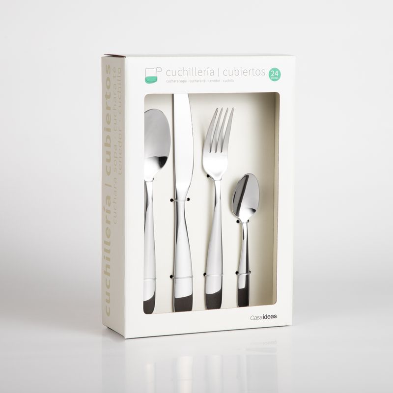 SET DE CUCHILLERÍA DE 24 PIEZAS. INCLUYE: 6 TENEDORES, 6 CUCHARITAS, 6 CUCHILLOS Y 6 CUCHARAS DE SOPA DE ACERO INOXIDABLE.