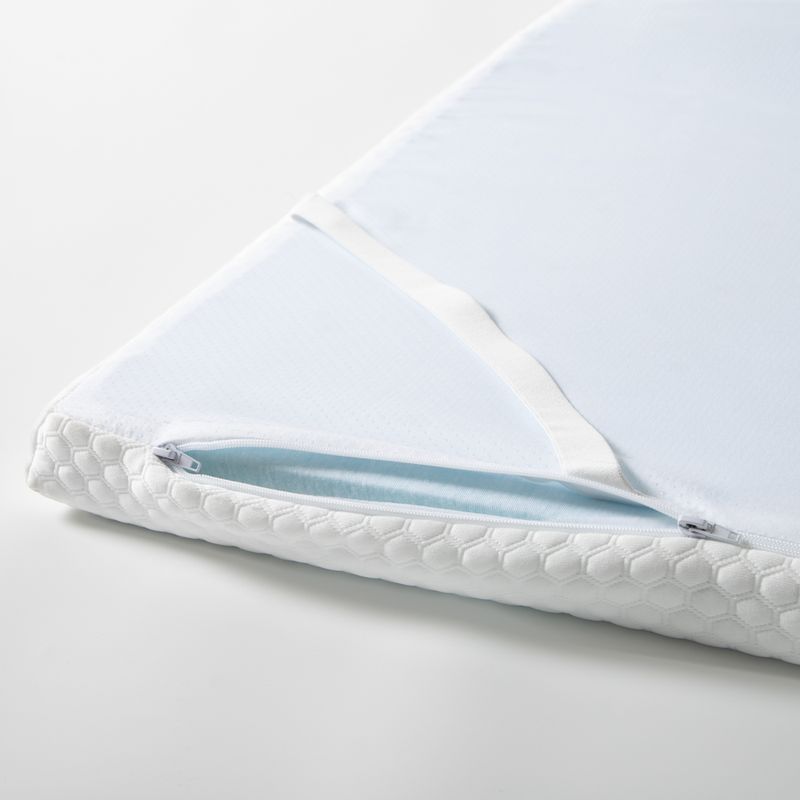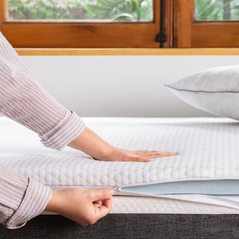 Topper de cama de memory gel con elasticos de sujeción. Ideal para complementar la comodidad de tu colchón, el topper de espuma con memoria de poliuretano de alta densidad, brinda un confortable y reparador descanso, ya que se amolda a la forma y peso de tu cuerpo de manera suave y natural. La espuma al tener una infusión de gel y orificios de ventilación mantiene la cama a una temperatura neutra, lo cual mejora tu descanso.